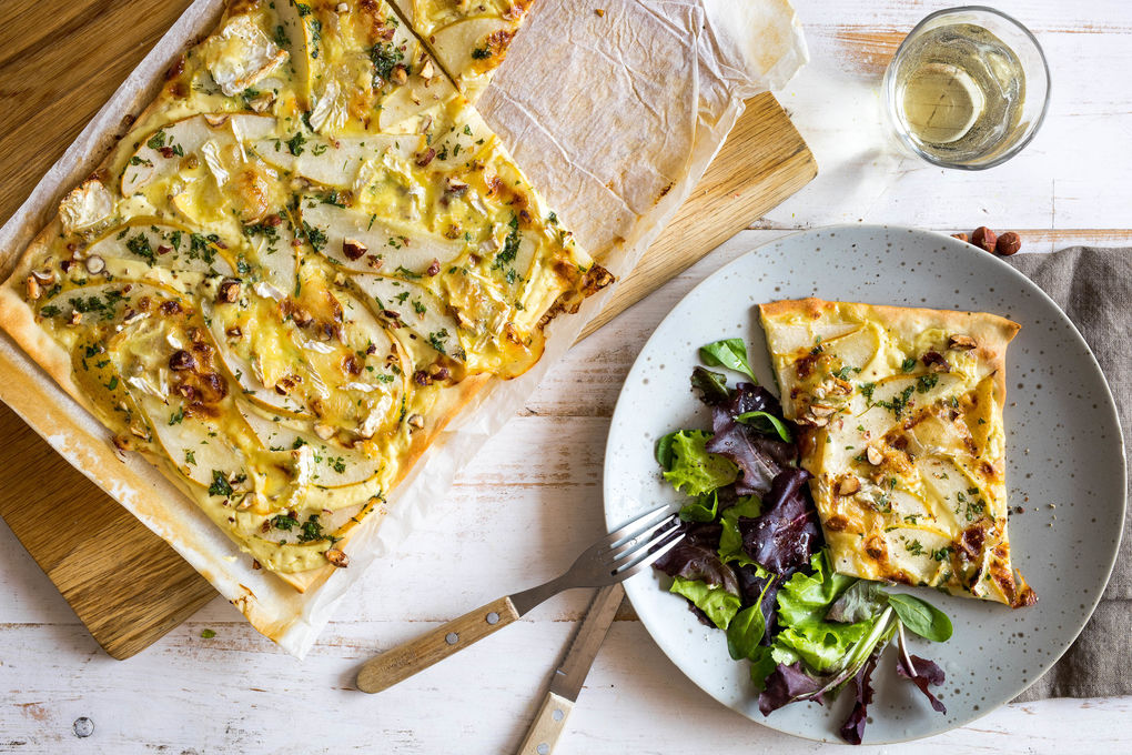 Camembert Birnen Flammkuchen Mit Haselnussen Und Gemischtem Salat Marley Spoon