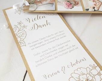 Die Dankeskarte "Liebesglück" bietet Platz für Ihre schönsten Fotos und lässt Ihren schönsten noch einmal Revue passieren. Dankeskarten – ein herzliches „Dankeschön“ nach einer gelungenen Hochzeit Sie haben Ihre Hochzeit mit Pauken und Trompeten gefeiert, traumhafte Flitterwochen verbracht und freuen sich nun auf die Ruhe, die so langsam wieder in Ihren Alltag einkehren soll?. Nun ist es an der Zeit, sich mit einer Dankeskarte Hochzeit mit einem persönlichen Text zu bedanken Nehmen Sie sich Zeit für die Worte, die Sie auf die HochzeitsDanksagungskarte schreiben möchten Schreiben Sie den Dankeskarten HochzeitsText persönlich, lassen Sie Ihre Erinnerungen aufleben und schreiben Sie aus Ihrem Herzen.