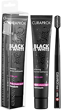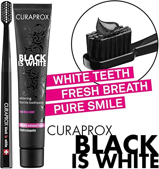 Amazon De Curaprox Black Is White Set Fur Weisse Zahne Zahnaufhellung Mit Schwarzer Zahncreme Aus Aktivkohle Whitening Toothpaste 1x Zahnburste Und Zahnpasta 90ml