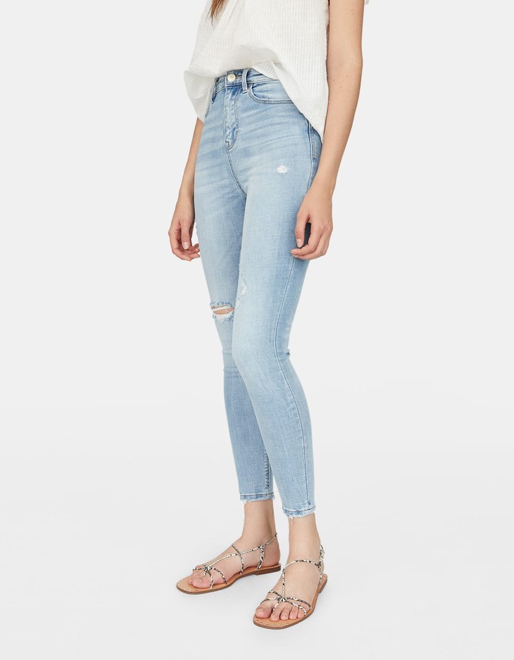 Buy Stradivarius super high waist skinny jeans in with rip in medium blue at ASOS With free delivery and return options (Ts&Cs apply), online shopping has never been so easy Get the latest trends with ASOS now.
