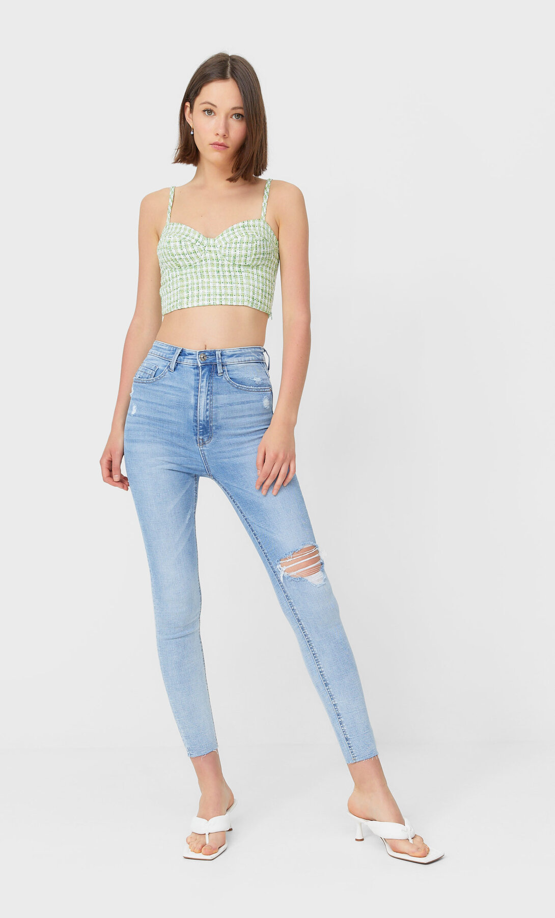 Don't think twice and be a modern and feminine girl with Stradivarius Super high waist!. Stradivarius super high waist skinny jeans in with rip in medium blue $2250 $30 Earn 5% cash back at ASOS Bershka super high waist skinny jean in black $3060 $36 Earn 5% cash back at ASOS Bershka super high waist skinny jean in dark blue $3240 $36 Earn 5% cash back. Stradivarius Skinny jean Petite jeans by Stradivarius Worn and shot by one of our models at home High rise Belt loops Zip fly Five pockets Skinny fit Tight cut, regular on the waist #AtHomeWithASOS.
