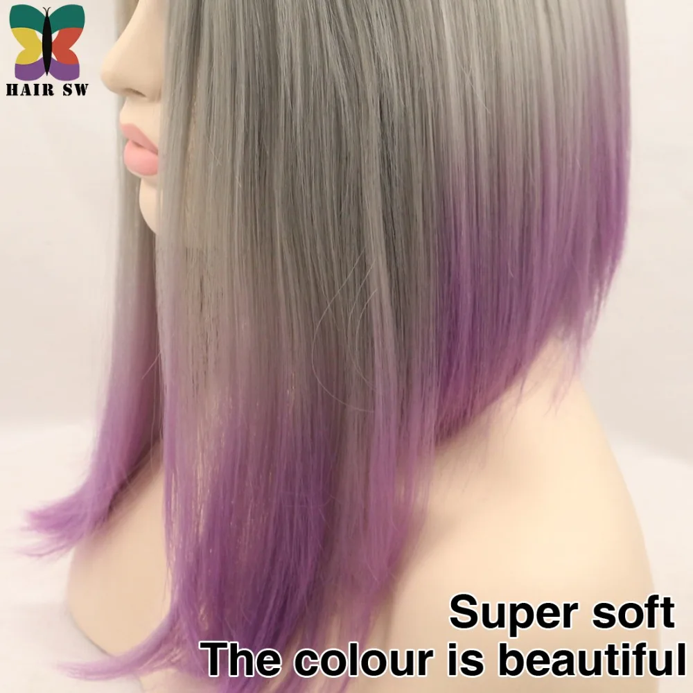 Haar Sw Medium Gerade Spitzefrontseitenperucken Ombre Grau Dip Dye Pastell Lila Mit Dunklen Wurzeln Hochtemperaturfaser Synthetische Perucken Aliexpress