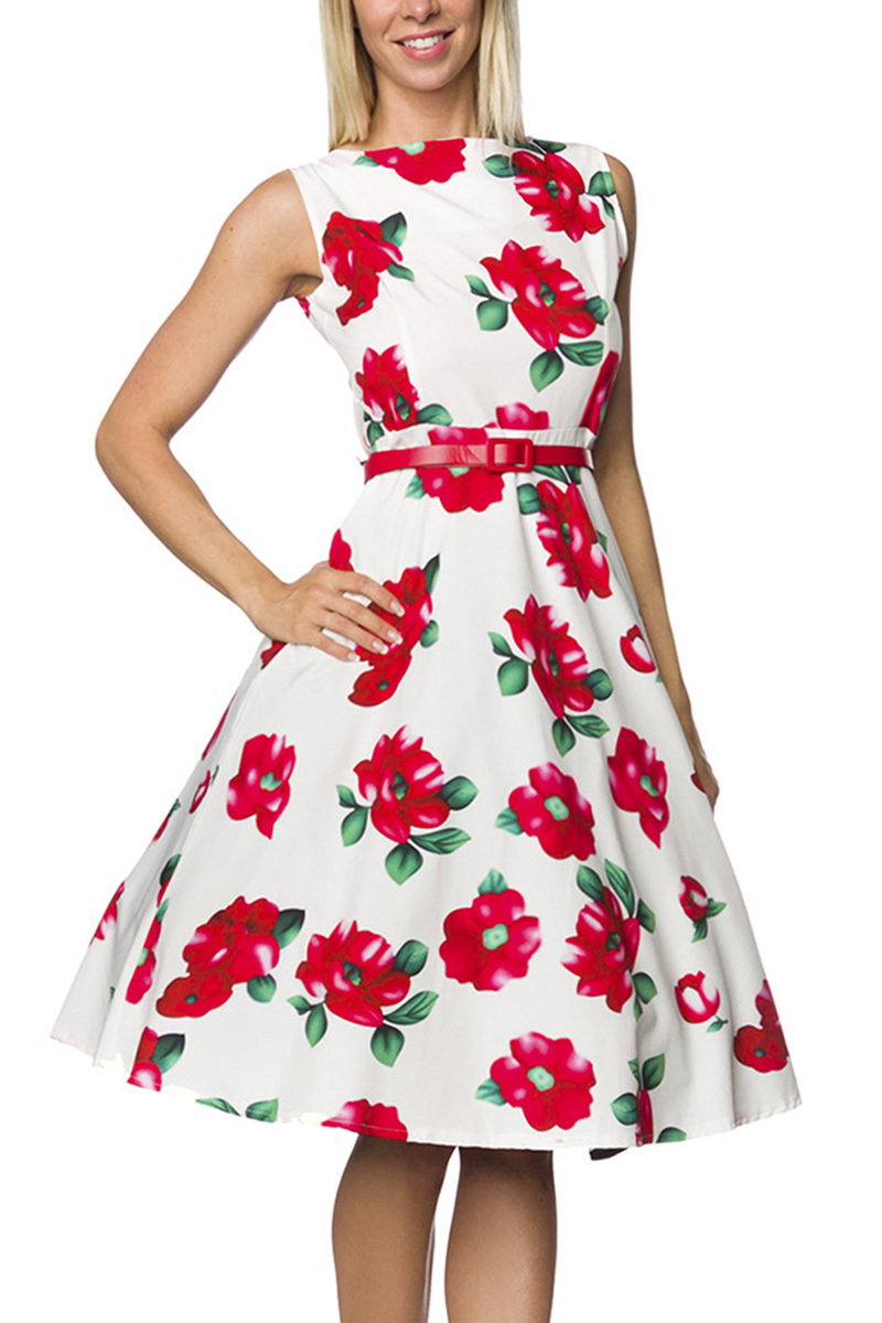 Rockabilly Kleid Weiss Rot Geblumt Kleid Knielang Mit Gurtel Bedruckt Retro Kleid Mit Blumen Vintage Kleid Mit Reissverschluss Abendkleid Sommerkleid Armellos Knielang Einzigartiges Design Mode Und Dessous Mit Stil Young Fashion
