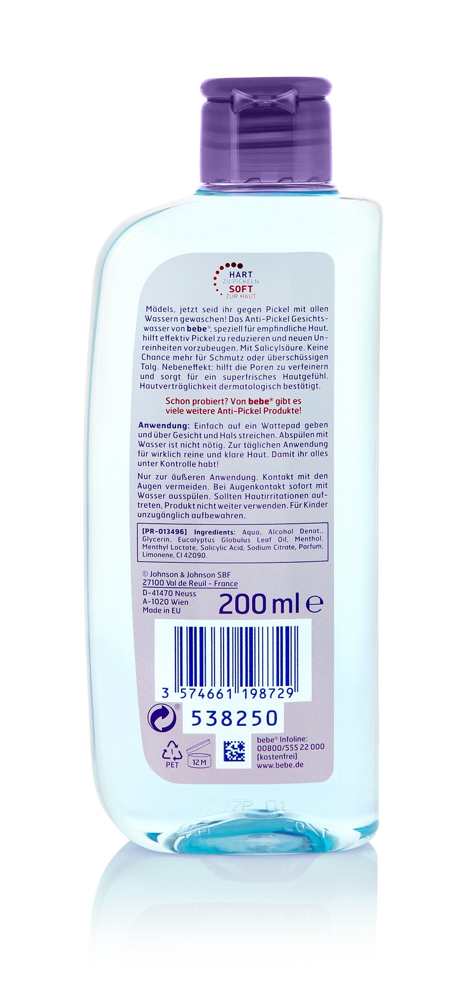 Die bebe 3in1 antipickel waschcreme mit 3 fachWirkung klärt die Poren, beugt der Neuentstehung von Pickeln vor und sorgt für ein mattiertes Hautbild Das bebe antipickel Gesichtswasser hilft Pickeln vorzubeugen und die Poren zu verfeinern Durch salicylsäure können Pickel bekämpft werden und die Neuentsteheung schonend verhindert werden.
