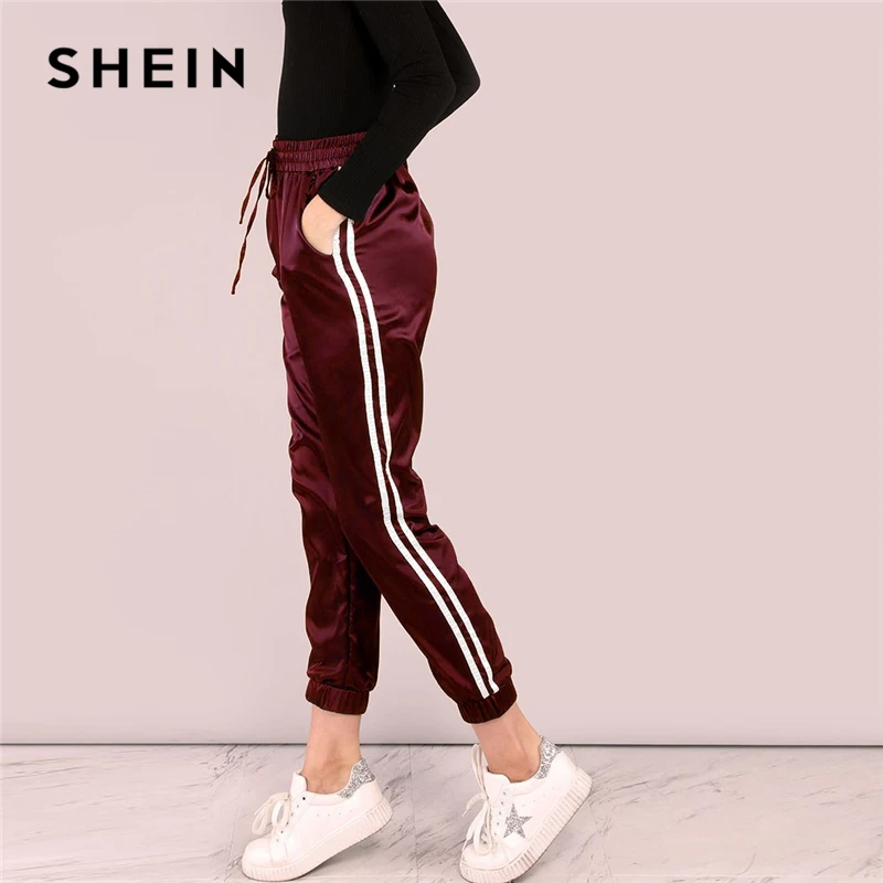 Shein Burgund Side Striped Satin Trainer Kordelzug Taille Mid Taille Jogginghose Joggers Herbst Moderne Dame Frauen Hosen Hosen Caprihosen Aliexpress