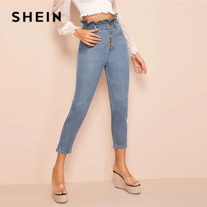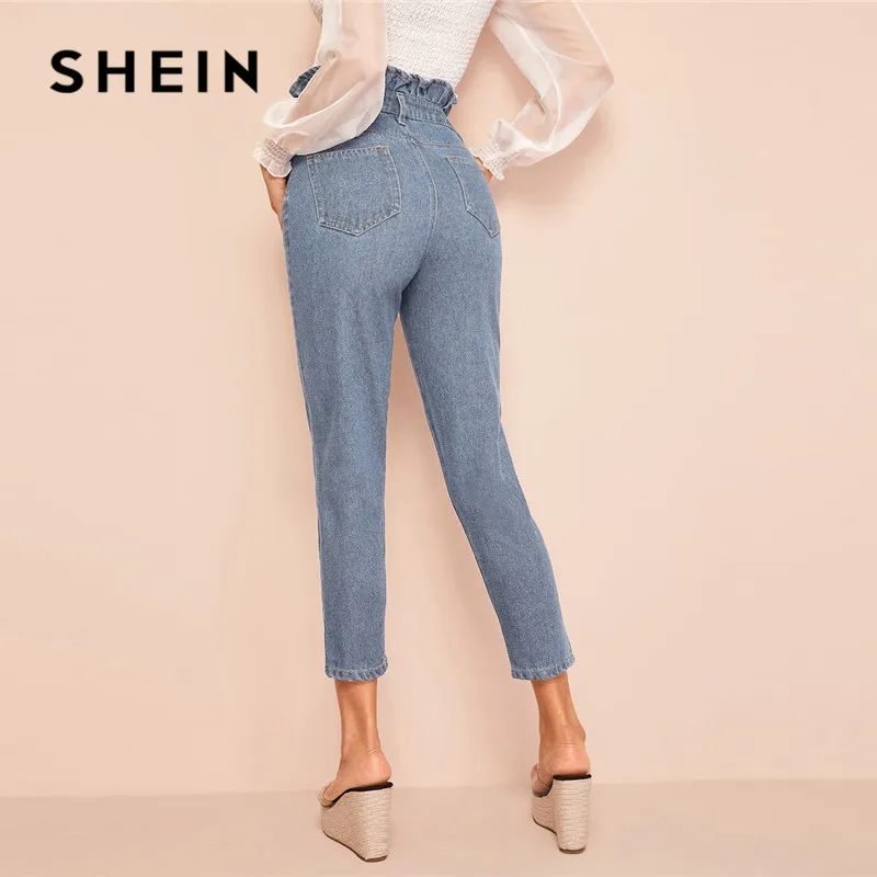 Shein Licht Waschen Taste Fly Paperbag Taille Dunne Jeans Frau Sommer Lassig Hohe Taille Jeans Blau Denim Damen Hosen Hosen Caprihosen Aliexpress