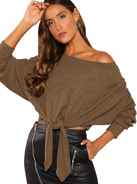 Shein Damen Bluse Mit Fledermausarmeln Mit Knoten Vorne Rippstrick Pullover Braun Gross Amazon De Bekleidung