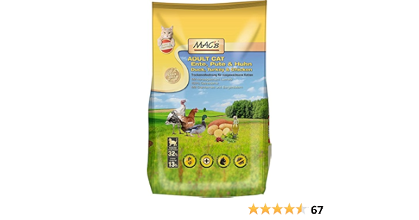 Mac's Katzenfutter getreidefrei Kitten, 15 kg Finden Sie alles rund um ihr Tier bei Amazon Gratis Versand durch Amazon schon ab 29€. MAC’s Cat Katzenfutter wird in Deutschland hergestellt und untersteht strengen Qualitätskontrollen Das Futter verfügt über einen für Trockenfutter relativ hohen Fleischanteil von bis zu 46% Hierfür werden leicht verdauliche Proteine verwendet aus dreierlei Geflügelsorten. Macs Katzentrockenfutter mit Ente, Pute und Huhn ist ein getreidefreies Trockenfutter für ausgewachsene Katzen mit norwegischem Lachsöl und Cranberries Zusammensetzung Geflügel (46%, bestehend aus 28% Geflügelfleischmehl, 6%.