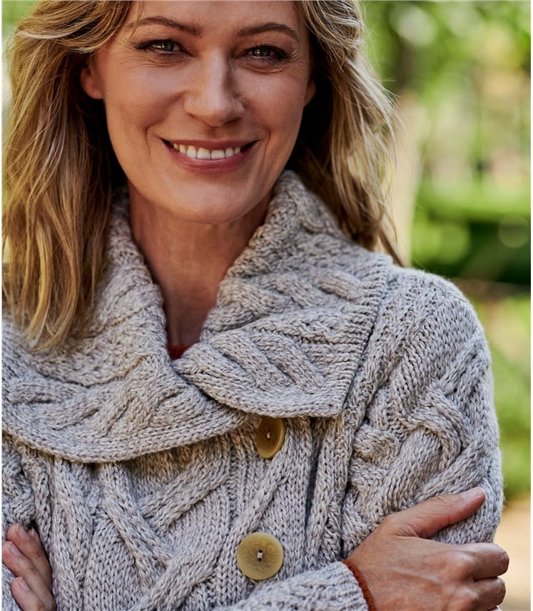 Aran Woollen Mills Lange Damen Strickjacke Mit Drei Seitlichen Knopfen