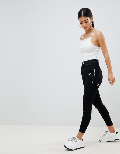Asos Design Petite Ridley High Waist Skinny Jeans In Black With Biker Zip Detail Asos