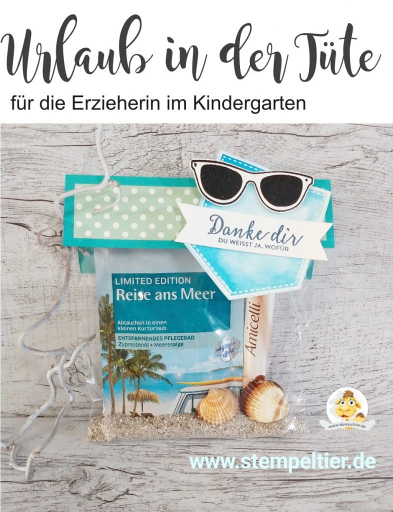 Einen schönen Urlaub zu wünschen bereitet mit unseren Geschenkideen besondere Freude!. Wenn auch du etwas basteln möchtest, um damit einem lieben Menschen eine Freude zu machen, bist du hier genau richtig, denn jetzt folgen die 10 besten Geschenkideen zum Basteln – da ist für jeden Anlass etwas dabei!. Eine kleine Tüte Urlaub für unsere Erzieherinnen!.