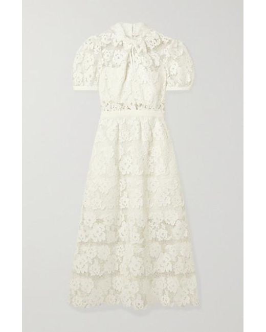 Self Portrait Spitze Midikleid Aus Guipure Spitze Mit Ripsbandbesatz In Weiss Lyst
