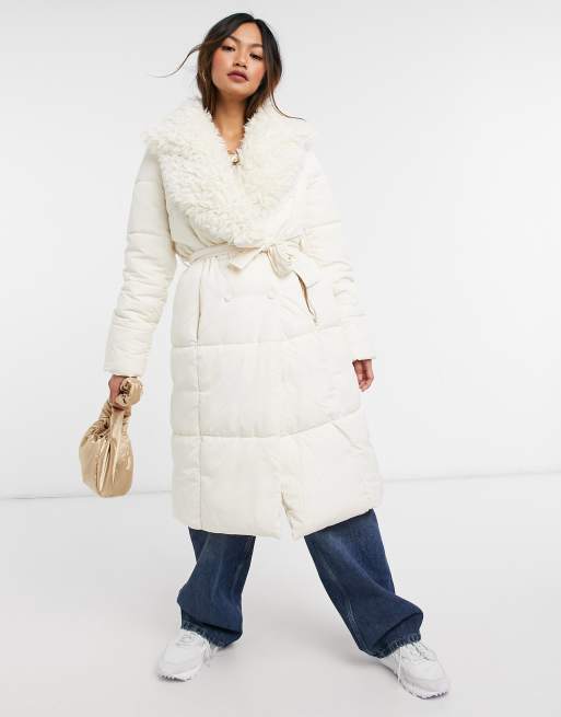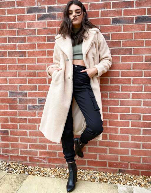 Cremefarbener Mantel In Maxilange Mit Teddyfell Topshop