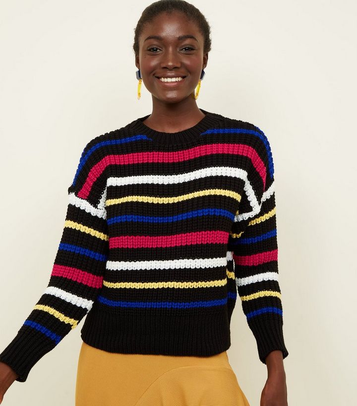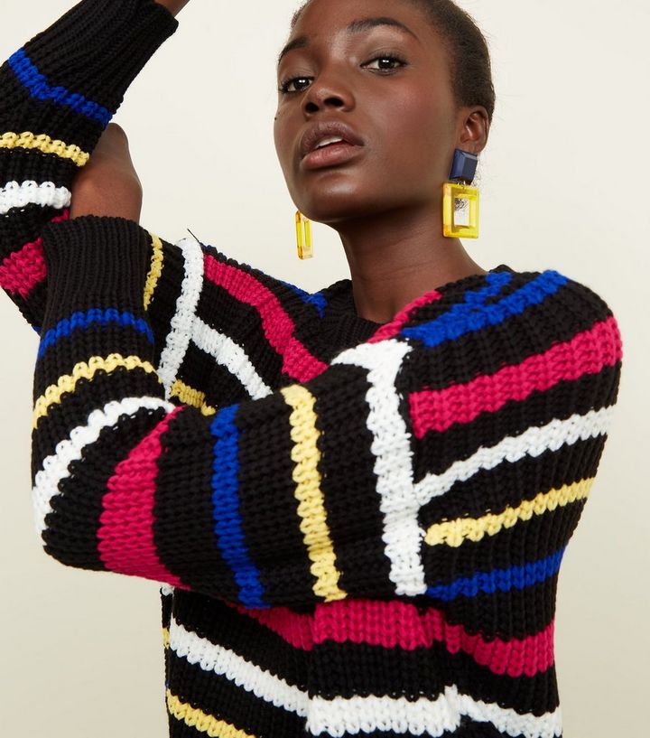 Schwarzer Pullover Aus Grobmaschigem Strick Mit Bunten Streifen Und Rundhalsausschnitt New Look