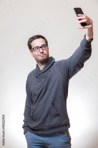 Junger Mann Macht Einen Selfie Selbstportrait Mit Seinem Handy Kaufen Sie Dieses Foto Und Finden Sie Ahnliche Bilder Auf Adobe Stock Adobe Stock