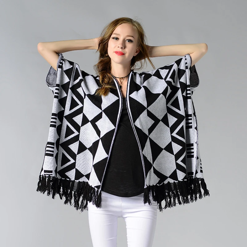 Damen Strick Poncho Cape Mit Fransen Schwarz Weiss Grosse Einheitsgrosse Amazon De Bekleidung