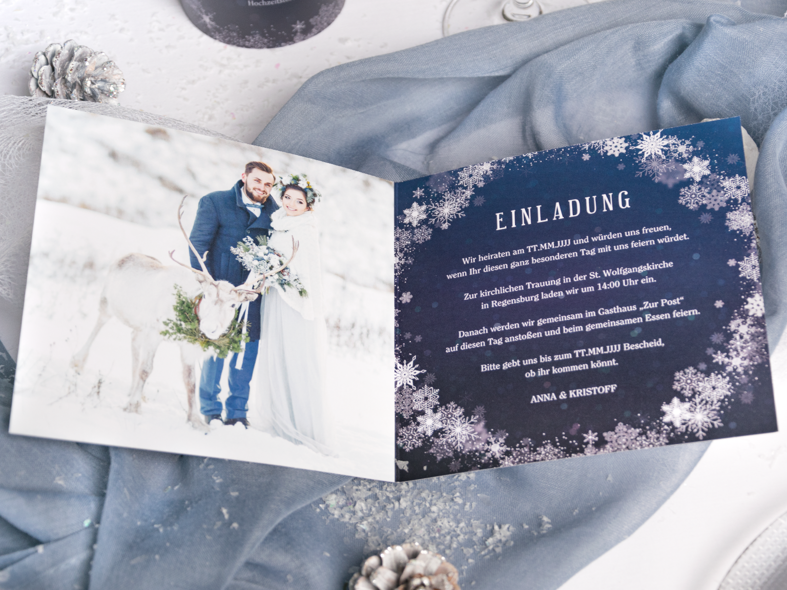 Einladungskarte Zur Winterhochzeit In Nachtblau Mit Schneeflocken Carinokarten