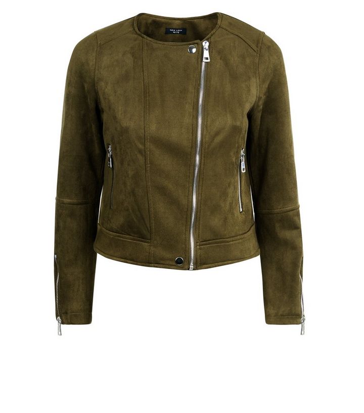 Petite Khakifarbene Bikerjacke In Wildleder Optik Ohne Kragen New Look