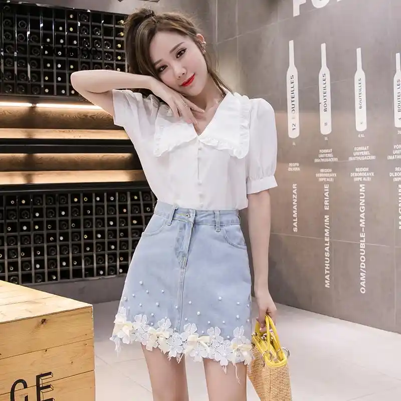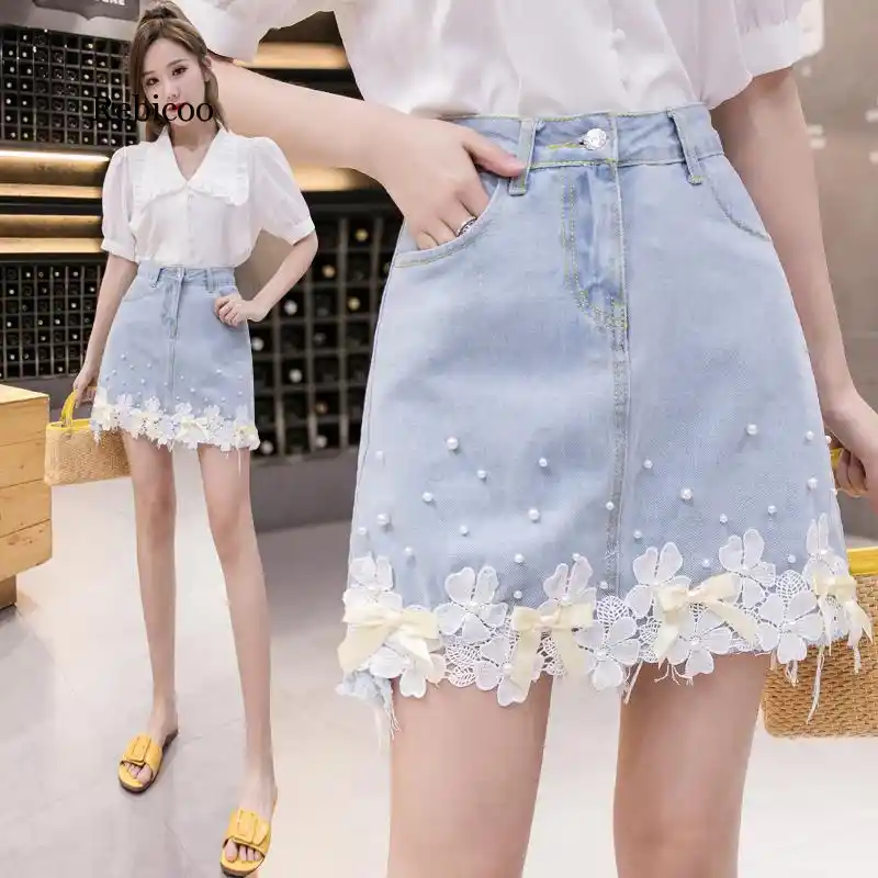 Mode Spitze Blume Denim Rock Sommer Perle Hohe Taille Damen Jean Mini Rock Kausalen Koreanische Dunne Madchen Kurze Faldas Rocke Aliexpress
