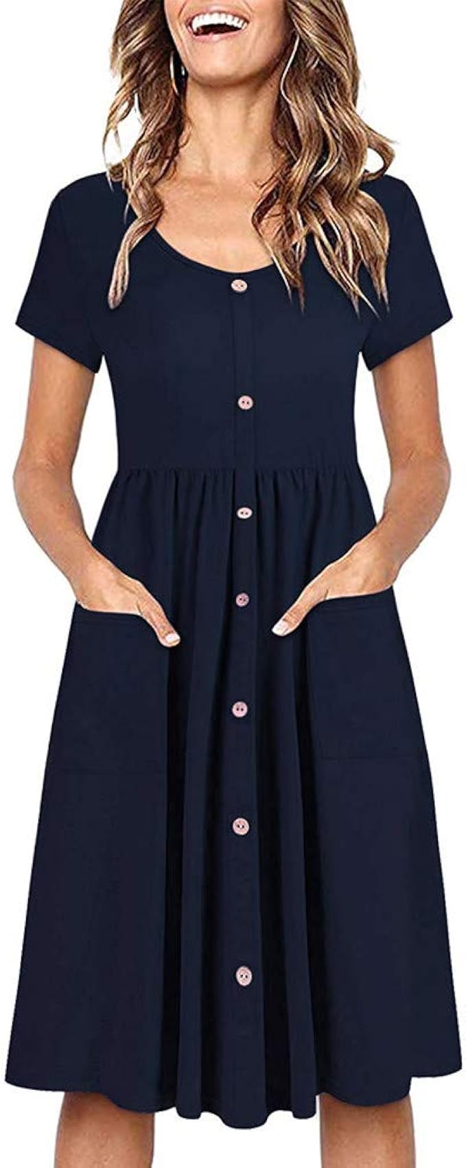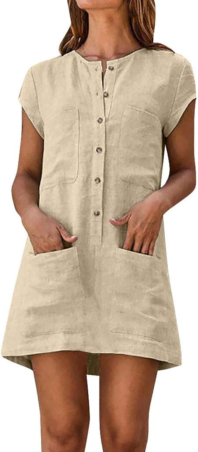 Lenfesh Sommer Damen Sommerkleid Freizeit Rundhals Kurzarm Kleider Strandkleider Blusenkleider Tunikakleid Partykleider Button Sundress Taschen Lassige Swing Dress Amazon De Bekleidung