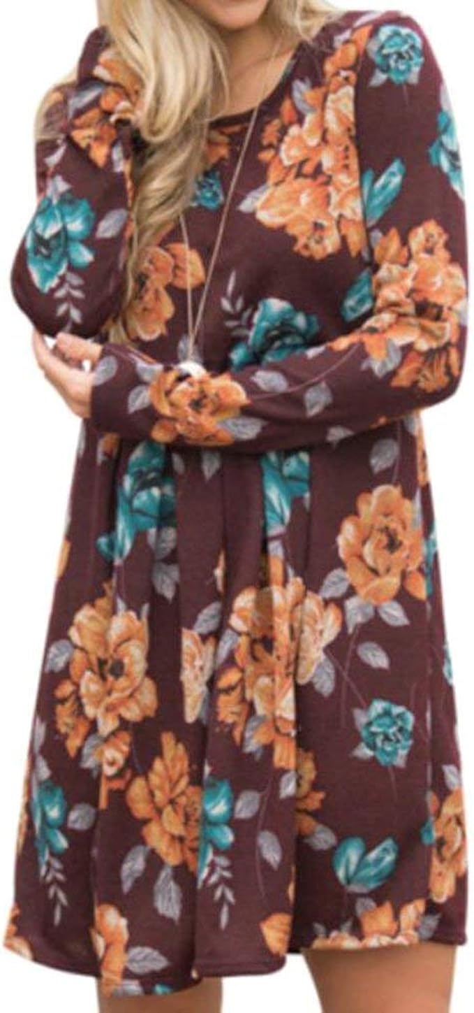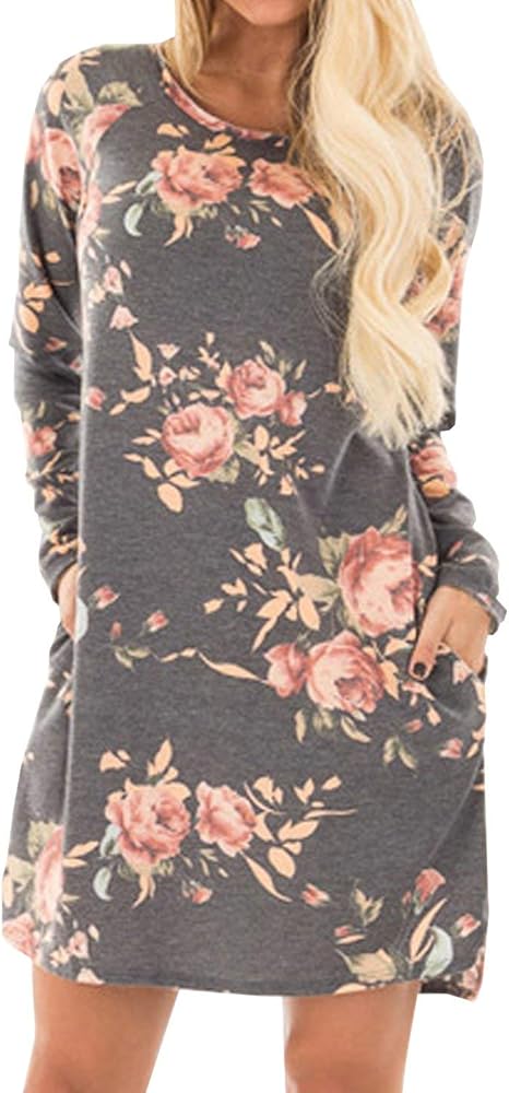 Xgbdtj Herbst Winter Neue Blumen Kleid Damen Rundhals Baggy Elegant Kleider Blusenkleider Stylish Unique Mit Aufgesetzte Taschen Langarm Minikleid Partykleid Amazon De Bekleidung