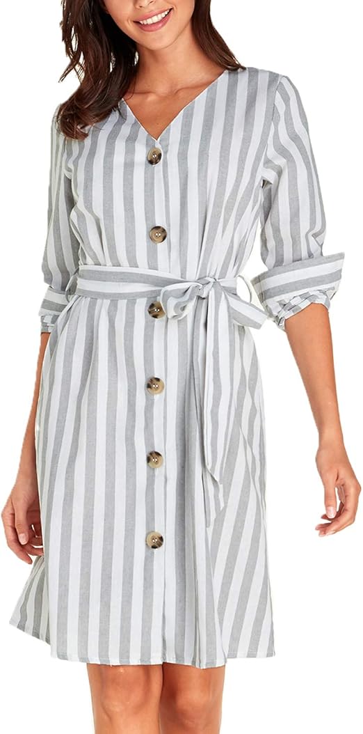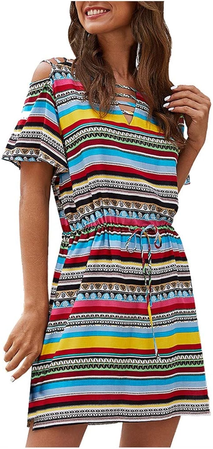 Rosennie Damen Kleider Sommer Elegant Gestreiften Freizeit Kleid Midi Kleider Rundhals Boho Sommerkleid Blusenkleider Kurzarm Sommerkleid Mit Kordelzug Kleid Partykleid Amazon De Bekleidung