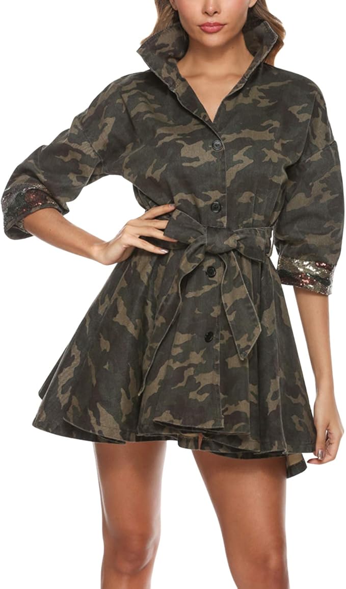 Semen Damen Blusenkleider Mini Tarnung Muster Revers 3 4 Armel Kleider Mit Gurtel Pailletten Amazon De Bekleidung