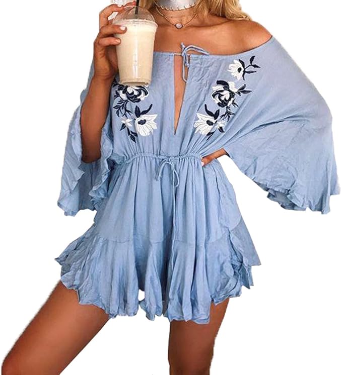 Sommer Kleider Damen Offener Kragen Blusen Kleid Minikleid Sexy Ein Wort Kragen Aufflackern Hulsen Bestickt Tunika Mini Halber Strandkleider Amazon De Bekleidung