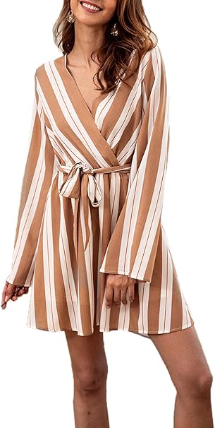 Oufour Fruhling Herbst Damen Minikleid Con Bandagen Gestreift Kleid Partykleid Cocktailkleid Ballkleid Mode V Schnitt Langarm Kleider Strandkleider Blusenkleider Amazon De Bekleidung