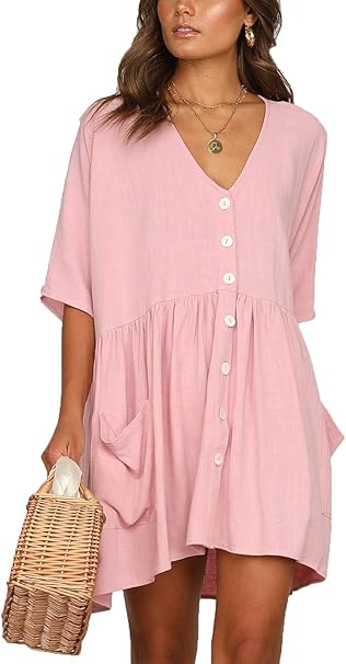 Lopily Damen Sommerkleider Einfarbig Einfach Bequem Freizeit Minikleid Frauenkleid Mit Knopf Lose Taschen Tunika Blusenkleider Ubergrosse Kleider Amazon De Bekleidung