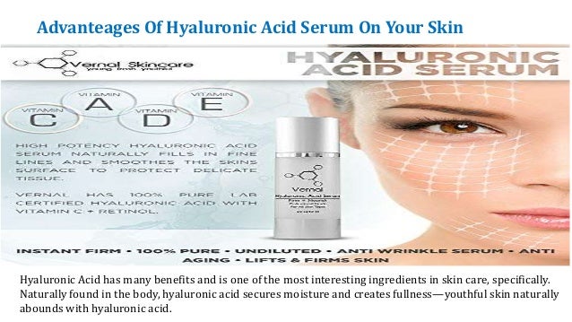 Hyaluronic acid serum features Some products contain hyaluronic acid as the primary ingredient (along with water), while others have added antiaging and beautifying ingredients and qualities, such as the following Vitamins For an extra boost, look for a serum that contains vitamins. What are the Benefits of Hyaluronic Acid Serum?. Antiaging In a 17 study, researchers examined the antiaging effects of hyaluronic acid supplements in 60 Japanese Wound healing Hyaluronic acid may help with wound healing by promoting skin hydration Hyaluronic acid not only Relieving joint pain Synovial fluid.