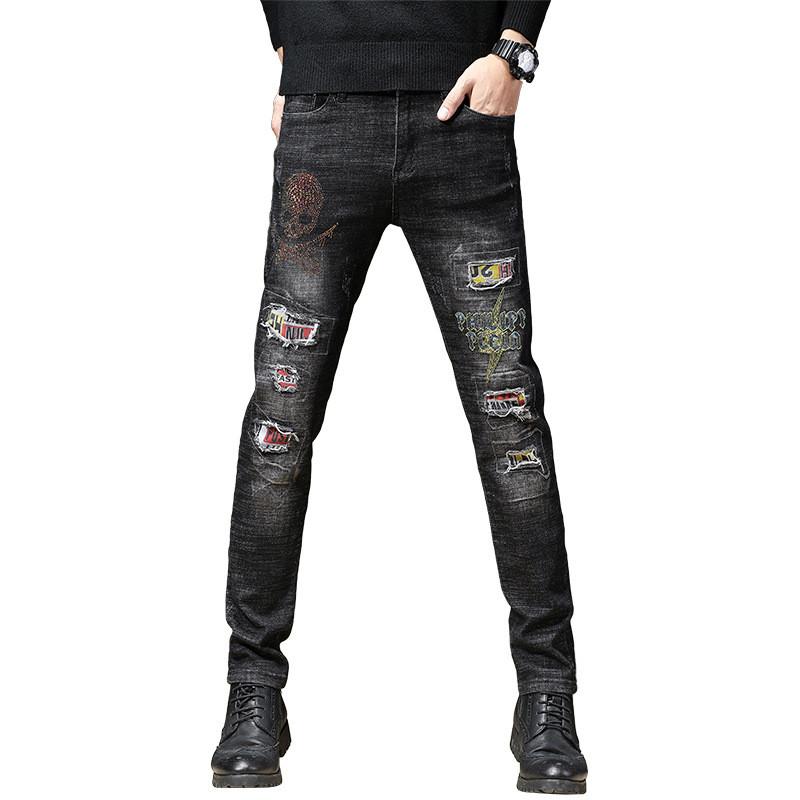 Hi Street Mens Distressed Biker Jeans Skull Patchwork Fashion Pleated Ripped Denim Joggers Black Slim Fit Trousers With Patches Mens Distressed Biker Jeans Distressed Biker Jeansbiker Jeans Aliexpress