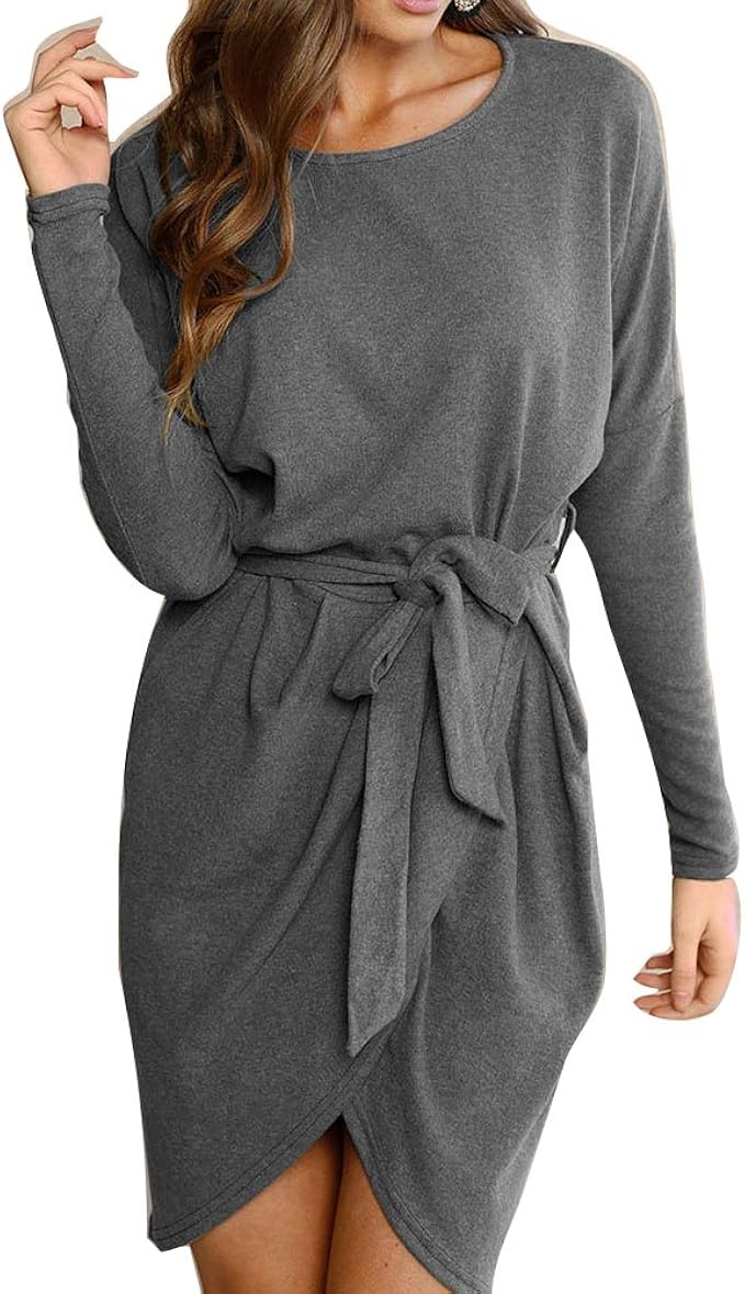 Hibote Damen Langarm Plain Kleid Split Bud Midi Kleider Frauen Herbst Knielange Kleider Krawatte Taille Asymmetrisches Kleid Lose Robe Khaki Schwarz Grun Grau Amazon De Bekleidung