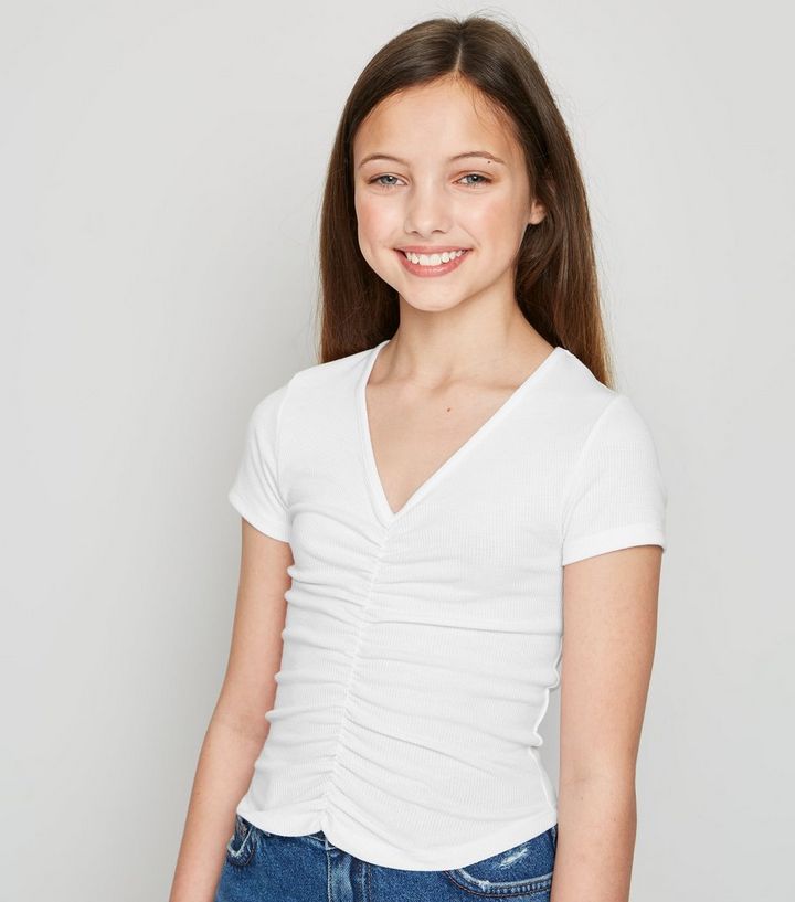 Girls Kurzarmliges Geripptes Oberteil In Weiss Mit Gerafften Details Vorne New Look