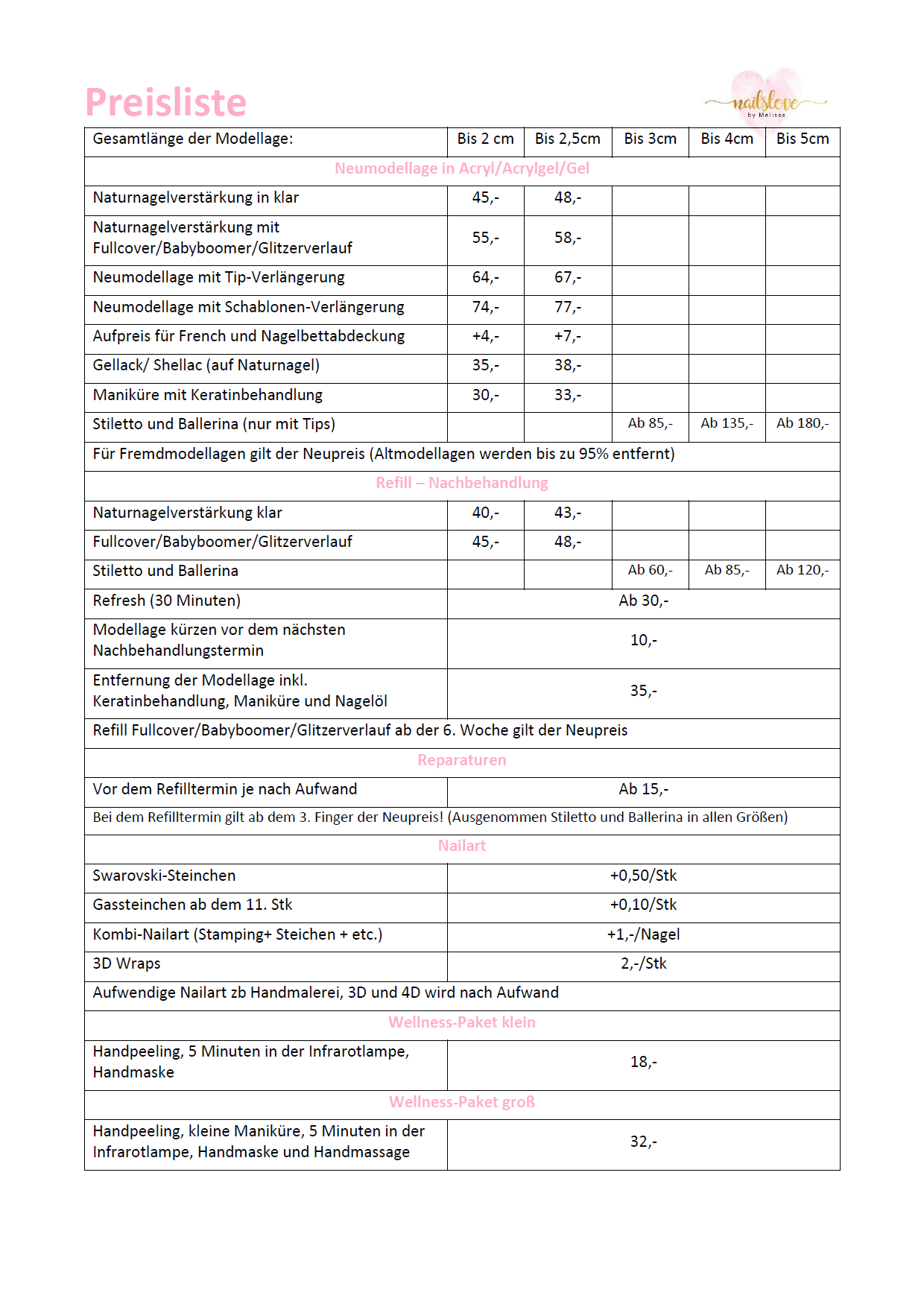 Preisliste Pflege ;. Preisliste (für größere Darstellung, bitte auf das Bild klicken) B itte beachten Sie, dass bei Fremdmodellagen, die nicht in unserem Hause gefertigt worden sind und sehr stark herausgewachsen und beansprucht bzw kaputt sind, eine Neumodellage gemacht und auch in Rechnung gestellt wird. Unsere Preisliste Hier finden Sie detaillierte Informationen zu den StandardPreisen für unsere Kosmetikbehandlungen und Leistungen Bitte beachten Sie, dass Sie bei einigen Services (Fingernägel, Wimpernverlängerung, Permanent Makeup) nach der ersten Behandlung im weiteren Verlauf lediglich nur das Auffüllen/Auffrischen bezahlen.