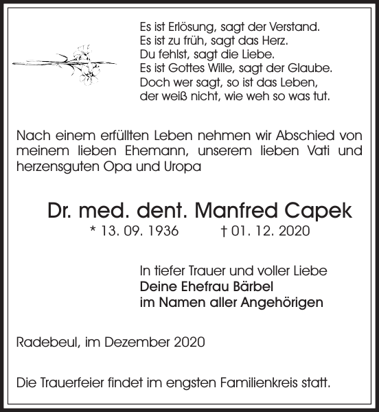 Dr Med Dent Manfred Capek Traueranzeige Sachsische Zeitung