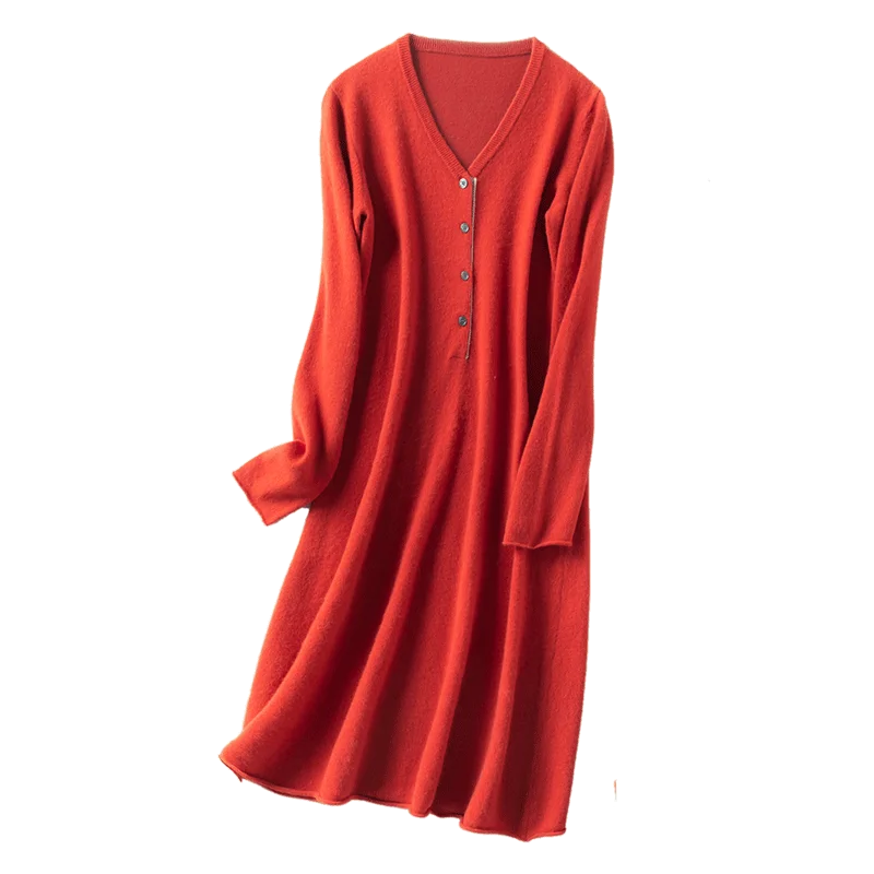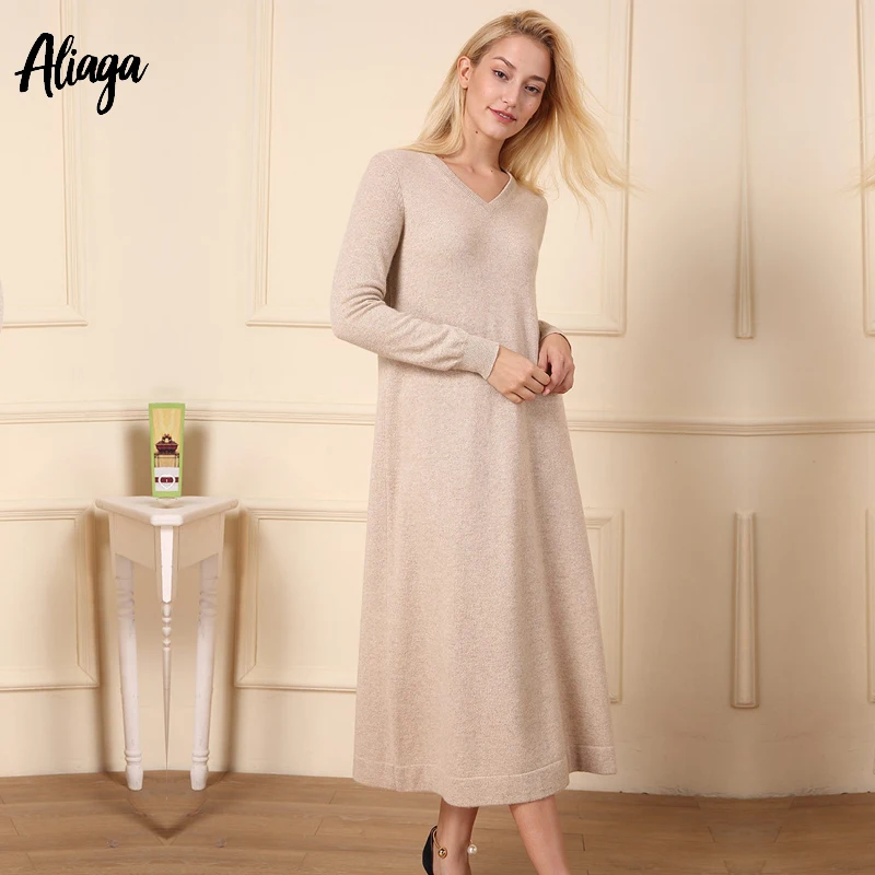 Organische 100 Kaschmir Kleid Weibliche V Ausschnitt Pullover Kleid Lange Herbst Winter Kniting Damen Casual Pullover Outer