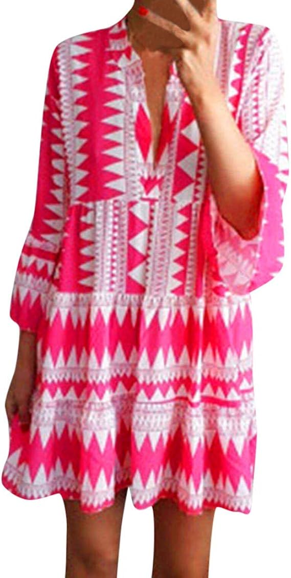 Amuster Damen Boho Strandkleid Langarm Tunika Sommerkleid V Ausschnitt Kleid Lose Blumenkleid Floral Minikleid Freizeit