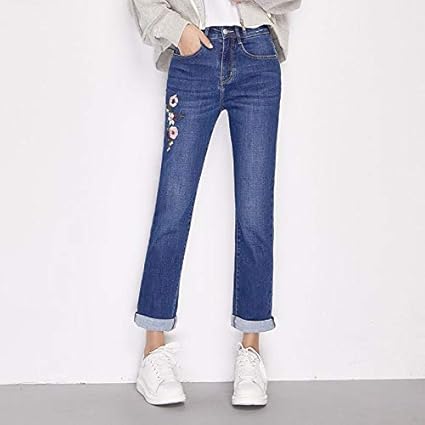 Fdbvdkz Damen Jeans Fruhling Und Sommer Neue Taille Schuss Hohe Taille Dunne Gerade Lange Jeans Blume Farbe Stickerei Elegante Frauen Jeans Amazon De Sport Freizeit