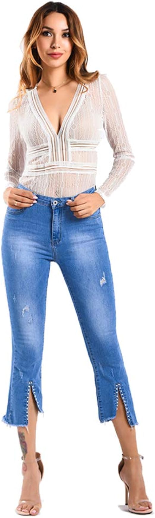 Suncaya Damen Jeans Gebrochenes Loch Niet Glocke Bottomed Hosen Fruhling Sommer Beilaufige Dunne Hosen Hose Amazon De Bekleidung