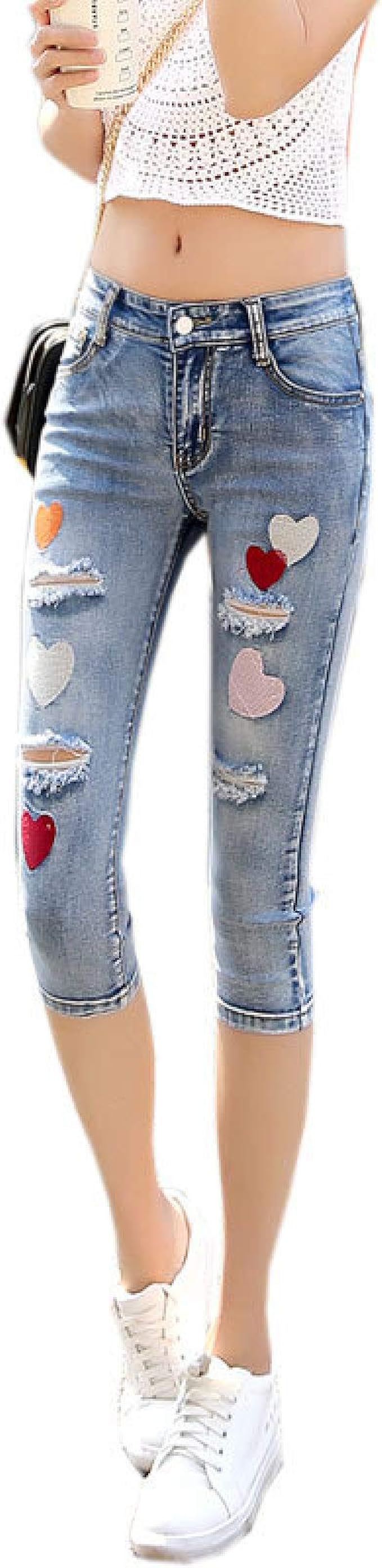 Generico Damen Sommer Jeans Mode Dunn Stil Personlichkeit Stitching Stickerei Slim Cropped Pants With Pockets Amazon De Bekleidung
