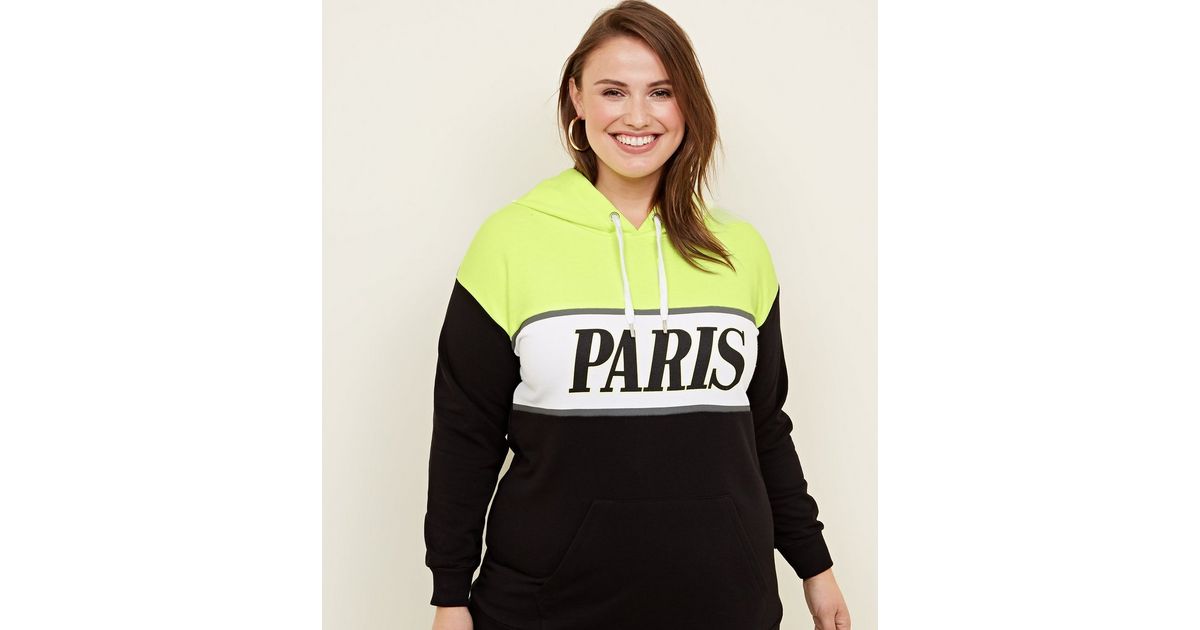 Curves Schwarzer Kapuzenpullover Mit Neonfarbenem Colour Blocking Design Und Paris Aufschrift New Look