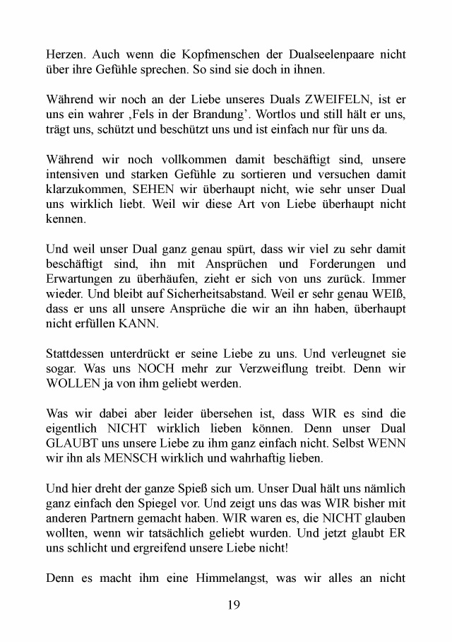 Mit Ihrem Seelenverwandten vor sich legen Sie die Ängste und Masken ab, die Ihnen die wahre Liebe verwehren Sie beide arbeiten im Gleichgewicht zusammen und streben stets nach Gleichheit und respektieren die Beiträge des anderen Die Liebe ist das Zentrum all dessen, was Sie tun. Wahre Liebe bedeutet, dass du dich um deinen Partner mehr kümmerst als um dich selbst Je mehr Selbstlosigkeit du in einer Beziehung zeigst, desto mehr Zuneigung bekommst du zurück Falls dein Partner etwas macht, worauf er keine Lust hat, nur um dich glücklich zu machen, kannst du schon behaupten, dass er dich wirklich liebt und alles tun. Seelenpartner grenzenlose Liebe Vorwort oder was wir unter Liebe verstehen Dieses Buch 'Seelenpartner grenzenlose Liebe' wollte unbedingt geschrieben werden Es war wie ein innerer, intensiver "Zwang" Manche Bücher will man ja aus einem eigenen Bedürfnis heraus schreiben Aber dieses Buch ist aus einer "höheren Macht" entstanden.