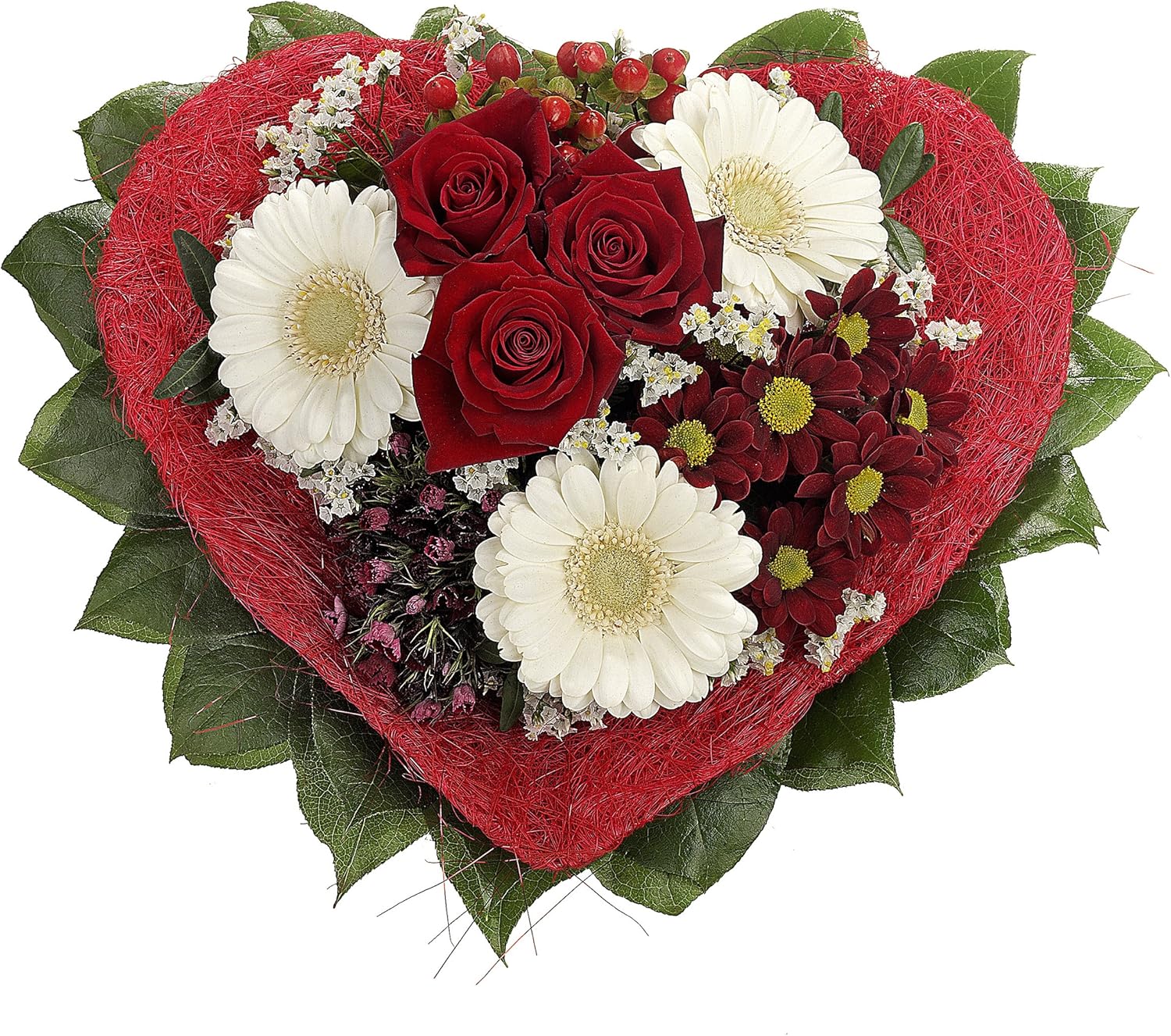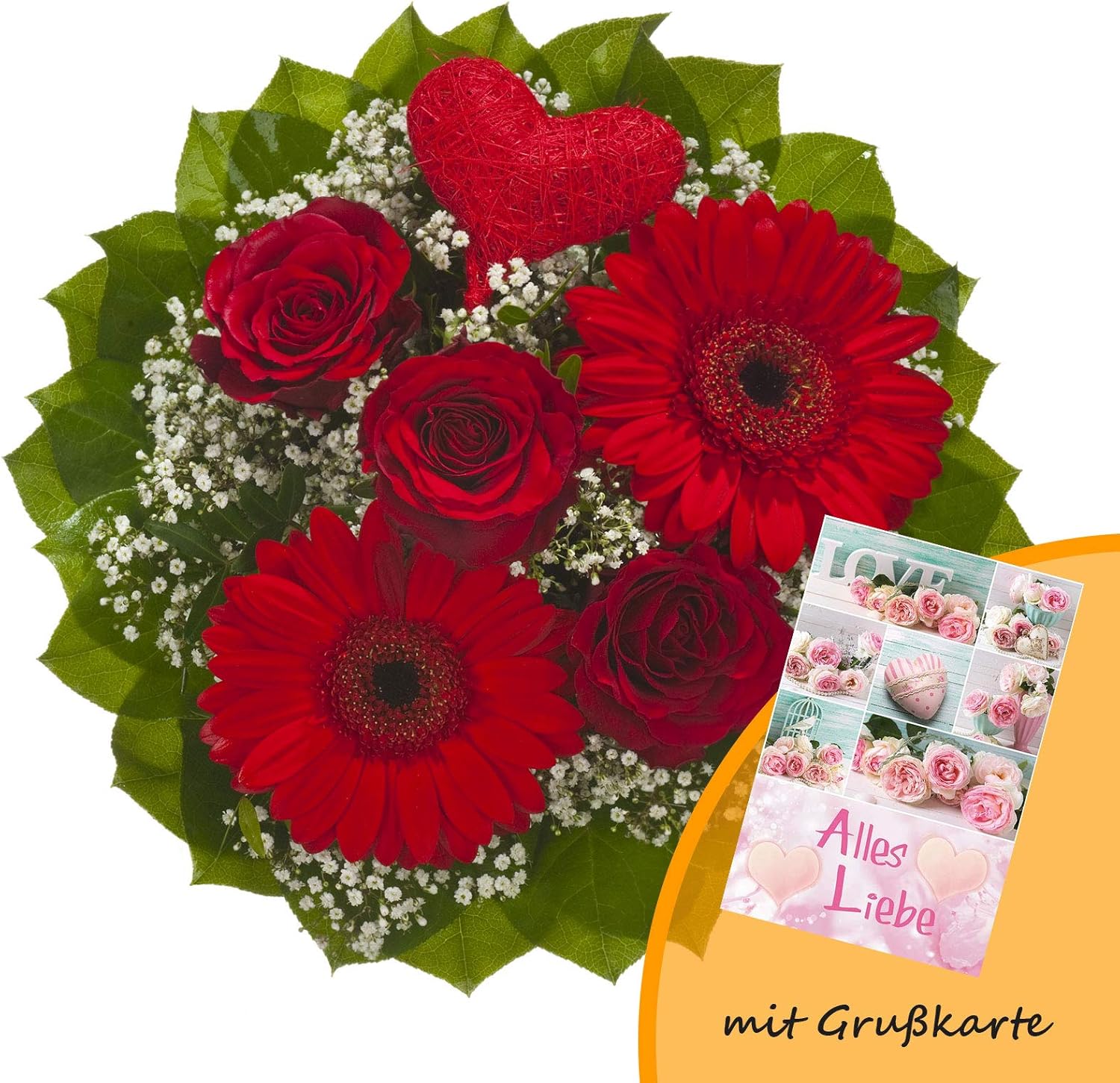 Dominik Blumen Und Pflanzen Blumenstrauss Mit Liebe Aus Roten Rosen Roten Gerbera Weissem Schleierkraut Und Dekoherz Aus Sisal Und Grusskarte Alles Liebe Amazon De Garten