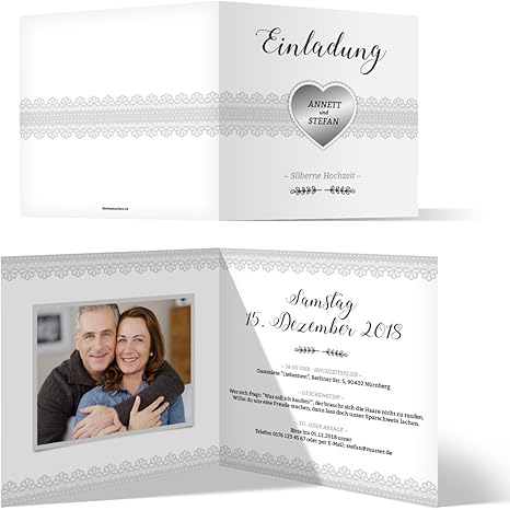 Jan 6, Explore Quinceanera's board "einladung silberhochzeit" on See more ideas about invitations, birthday invitations, fun wedding invitations. Elegante Einladungskarten für die Silberhochzeit selbst gestalten Die Silberhochzeit ist ein bedeutender Meilenstein in Eurer Ehe, den Ihr durch ein tolles Miteinander und ein großes, gemeinsames Ziel erreicht habt Wenn ein Paar 25 Jahre verheiratet ist, dann ist das ein hervorragender Grund für eine kleine Feier. Postkarte mit Direktversand 49/5 Bewertungen Das sagen unsere Kunden 1600 Sehr gute Qualität, sehr schnelle Lieferung, alles Top!.