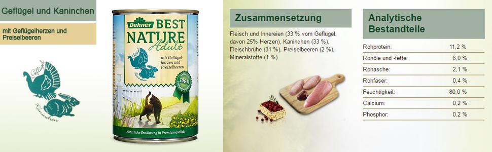 The best food for your cat Balanced and 100% natural nutrition for your furry friend We love Cats Cats deserve the food nature intended for them, whether they're cuddly kitties, mousers or couch potatoes That's exactly why we founded CAT'S LOVE For cats who live a healthy and happy life by your side. Best Nature Katzenfutter Adult Wild und Ente mit Nudeln;. Dehner Best Nature Adult Nassfutter für ausgewachsene Katzen ist eine einzigartige Kombination mit natürlichen Zutaten in Premiumqualität Das schonende Garverfahren und die Kaltabfüllung gewährleisten, dass die ursprünglichen, natürlichen Nährwerte weitestgehend erhalten bleiben.