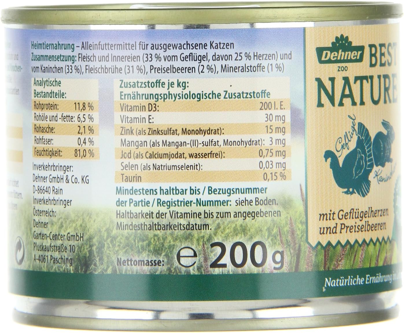 Chicken byproduct meal, ground yellow corn, corn gluten meal, whole grain wheat, rice, soy flour, beef fat preserved with mixedtocopherols, chicken, fish meal, liver flavor, phosphoric acid, calcium carbonate, salt, potassium chloride, choline chloride, MINERALS zinc sulfate, ferrous sulfate, manganese sulfate, copper sulfate, calcium iodate, sodium selenite, taurine, VITAMINS Vitamin E. Best Nature Katzenfutter Adult Wild und Ente mit Nudeln;. Alle Cat’s Best Produkte können Sie bequem online bestellen oder bei Ihrem Händler vor Ort einkaufen Hier finden Sie die passende Anschrift für Ihren Einkauf.