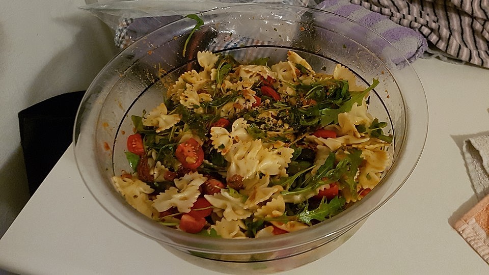 Die besten Nudelsalat mit Pinienkerne und Rucola Rezepte Nudelsalat mit Pinienkerne und Rucola Rezepte und viele weitere beliebte Kochrezepte finden Sie. Italienischer nudelsalat mit rucola und getrockneten tomaten Wir haben 44 raffinierte Italienischer nudelsalat mit rucola und getrockneten tomaten Rezepte für dich gefunden!. Zubereitung Nudelsalat mit Rucola, Oliven & getrockneten Tomaten Die Farfalle in einem großen Topf mit reichlich Salzwasser nach Packungsangabe al dente kochen Während die Nudeln kochen, das Dressing zubereiten Dafür DijonSenf mit Agavendicksaft, Balsamico, Salz, Pfeffer, ChiliFlocken und Kräutern der Provence verrühren.