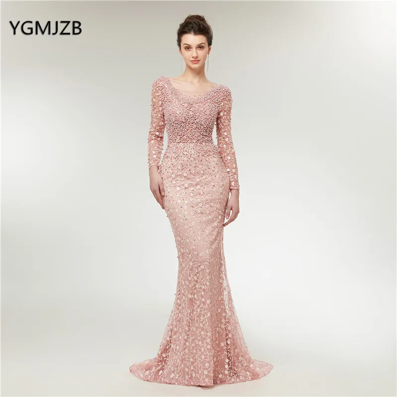 Thepastthatremains Kaufen Gunstig Luxus Abendkleider 19 Meerjungfrau Lange Armel Perlen Spitze Stickerei Rosa Frauen Formale Party Kleid Prom Robe De Soiree Preise Online