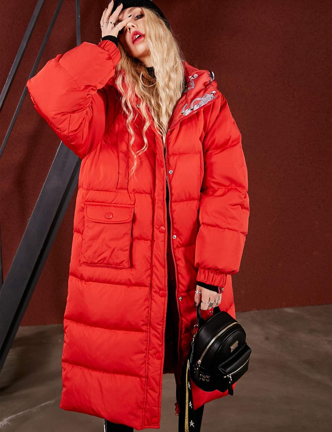Elf Sack Damen Wintermantel Daunenmantel Warm Lange Daunenjacke Mit Kapuze Aufdruck Daunen Outdoor Parka Steppmantel Rot M Daunenmantel Jacken Wintermantel